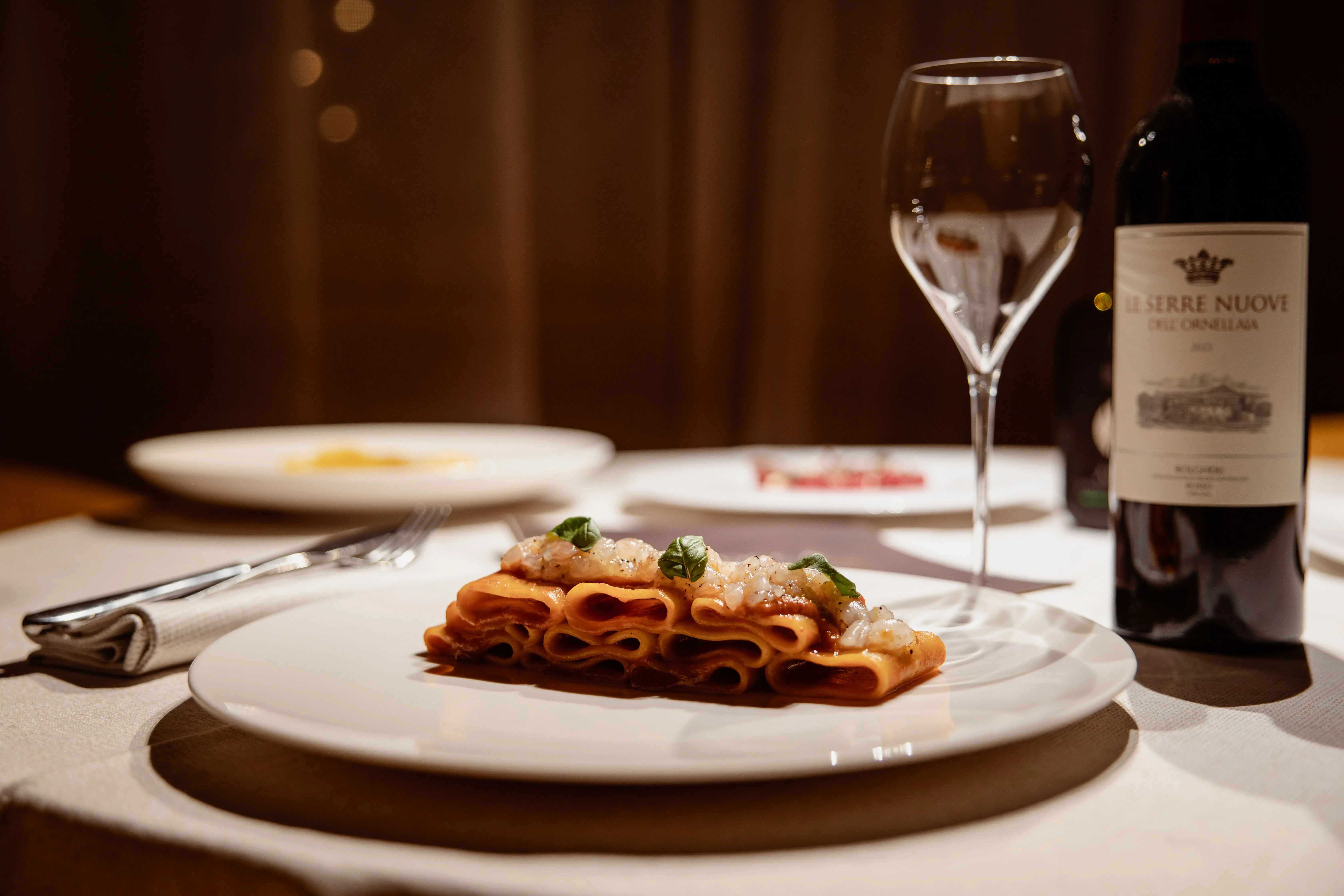 Mezzo pacchero in estrazione di zuppa di scoglio e crudo di gambero rosa di Santo Stefano.